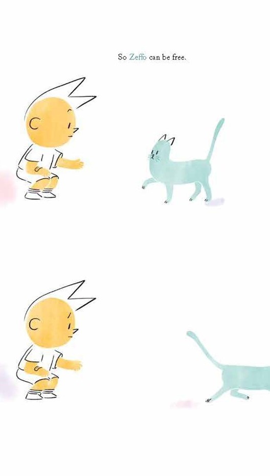 Eventually, Arthur and Zeffo reconcile. The boy has begun to realize that love doesn’t confer the freedom to subject his pet to constant control. Zeffo also recognizes that he needs Arthur. This idea is visualized in a scene of tentative approach and flight, where Zeffo seems open to playing with Arthur but, once again, turns from him, his body divided as he escapes the page. Leynaud grants Zeffo the freedom to “hang back,” and even “be suspicious.” There is gentle humor in a picture of the boy crawling along as shower curtain rod and the cat turning his head to look at him, although it also seems dangerous! It’s fun to play, but when the game is over, Arthur again resists the confines of the page.