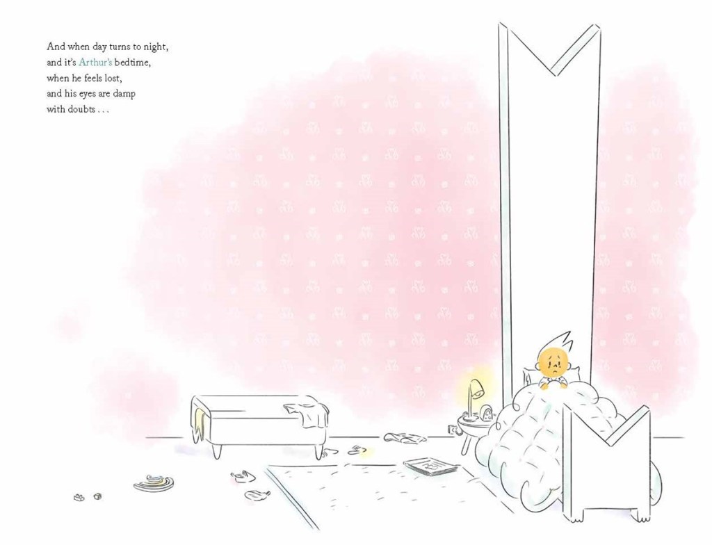 An anxious Arthur sits up in his elaborate bed, in a picture that calls to mind the illustrations for James Thurber’s Many Moons, by either Louis Slobodkin or Marc Simont. The enormously high headboard on the right side of the page seems ironic in light of the minimalist disorder of objects to the left. When Zeffo climbs up onto Arthur’s fluffy quilt, the patience of both boy and cat has been rewarded.