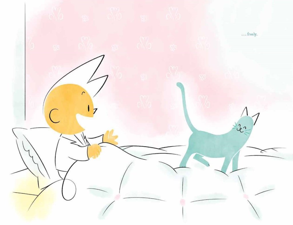 Arthur is a little boy who loves his cat, Zeffo. They are inseparable. The problem is that boy and cat have somewhat different definitions of love. Arthur would like to hold Zeffo tightly and read to him. But he also insists on styling Zeffo’s fur and applying perfume to him. (images). Arthur’s Cat is a book that helps children to think about what it means to love someone, hardly a unique subject. There are many wonderful books that explore the same idea. (such as this and this.). Johan Leynaud’s text and artwork are distinctive. The pictures, rendered in pencil, ink, felt, and pen, and digitally, are simple and luminous, conferring a dual quality which makes them both realistic and strikingly stylized. The book is beautiful, without a trace of preachy sentimentality.