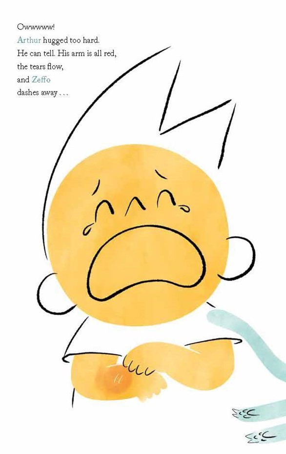Most of each scene is in black and white, with pastel touches. Zeffo is sky blue, and Arthur has a gold face and limbs. His hair and clothing are white, outlined in black. Leynaud’s use of line is so skillful that each picture seems to emerge fully realized. A pyramid of cluttered objects rises to the left of a page, and Arthur gleefully runs towards his beloved cat. Zeffo objects to being forced into a superhero costume and flies off the facing page. At the same time that the images are reminiscent of animation, there is a stillness to each picture, encouraging the reader to respond to each one individually.