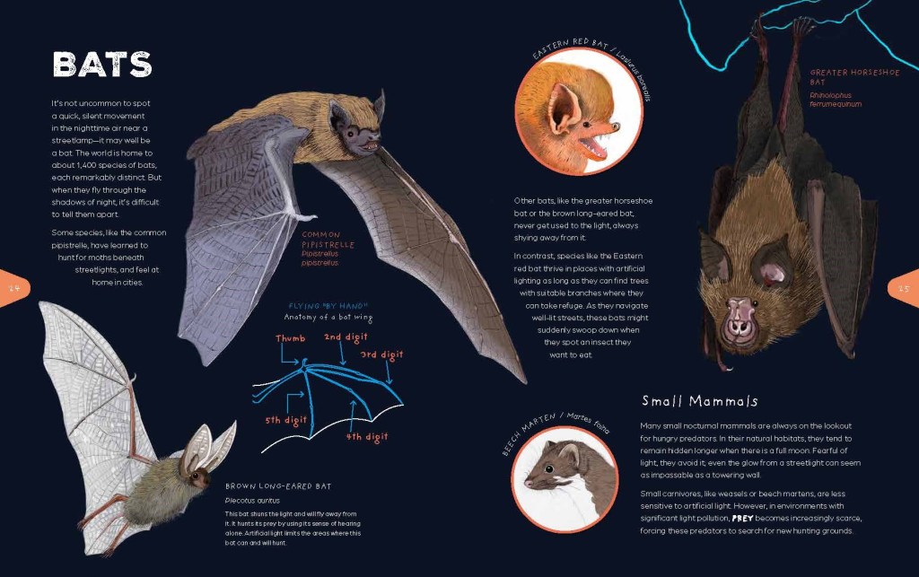 Bats are on most readers’ top-ten nocturnal animals lists. The authors’ language clearly confirms that affection. “It’s not uncommon to spot a quick, silent movement in the nighttime air near a streetlamp – it may well be a bat…Some species, like the common pipistrelle,…feel at home in cities.”