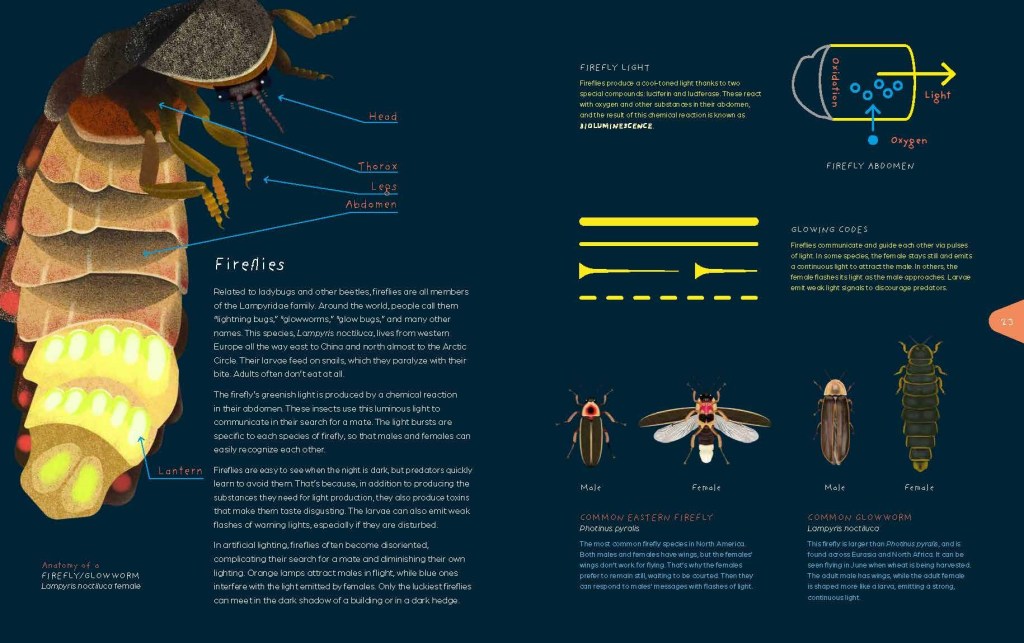 The detailed section on fireflies demystifies their characteristic glow, explaining the chemical reaction that causes it. While people enjoy watching them light up the night, these insects avoid predators as they “produce toxins that make them taste disgusting.” As if you did not already identify with the fireflies’ dilemma, “In artificial lighting, fireflies often become disoriented, complicating their search for a mate and diminishing their own lighting…Only the luckiest fireflies can meet in the dark shadow of a building or in a dark hedge. STEAM books do not have to sacrifice literary polish in order to educate children!