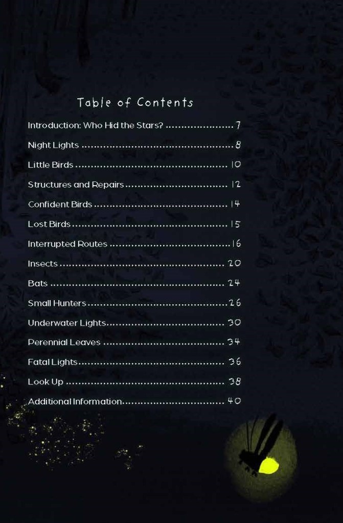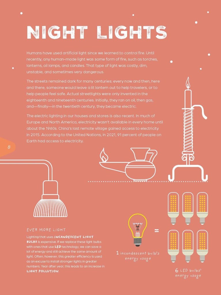 Sometimes books about environmental pollution adopt an all-or-nothing approach. Given the grave dangers posed to our natural world, and the fact that books for children inherently require some simplification, this is not surprising. In Who Hid the Stars? How Light Pollution Changes Our World, the authors’ and illustrator’s approach is more nuanced. The book’s premise is that artificial light is useful, but also involves potential damage to plants, animals, and humans. We are responsible for balancing the costs and benefits of technologies that make modern life possible, and for devising solutions to the negative effects they impose.