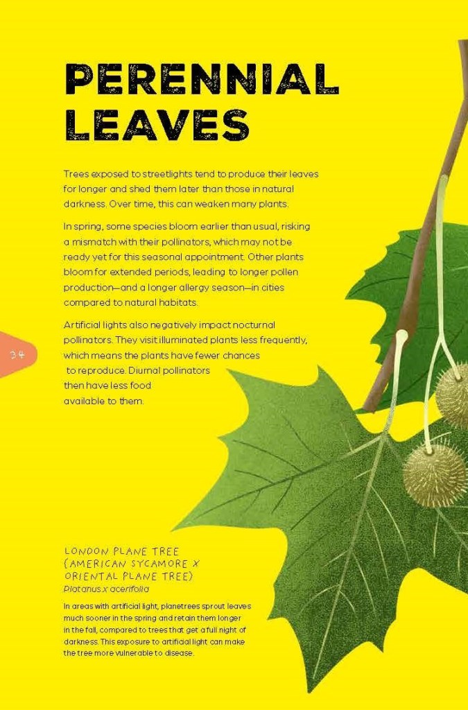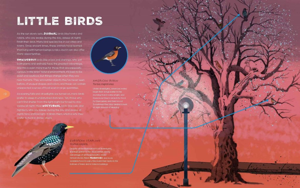 Graphic sophistication defines this work. Individual chapters present different species affected by artificial light. Small birds, such as the American robin, have their daily cycle of song and their search for food altered by the glare of streetlights. The crucial nest-building activities of swallows and sparrows is altered by lights that, in effect, mislead the birds in their selection of sites. “They may even choose streetlights or roof lights: though this protects them from nocturnal predators, they risk not being able to sleep at night if the light is too bright.” While the information is entirely accurate, there is an almost novelistic tone. Without personifying the birds, the authors convey a poignant note of empathy. Imagine choosing a home because of its appealing brightness, only to find that you are losing sleep! Some of the section titles are also poetic, such as “Confident Birds,” “Lost Birds,” and “Fatal Lights.”