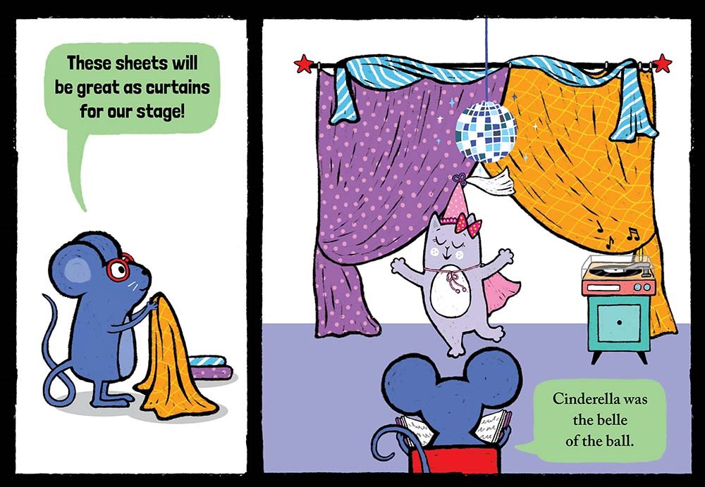 Mouse suggests a new role. It’s not exactly new, given the “Three Blind Mice” performance, but it has a new name, “narrator.” The sheets used as walls for the reading fort will become stage curtains. Mouse will read aloud the story of Cinderella, while Kat, costumed in a pink cape and hat, delivers a heartfelt performance of the lead role. Indeed, Kat is the “belle of the ball,” and Mouse is happy. They are best friends, they both enjoyed eating chips, even if Mouse found Kat’s loud crunching to be a distraction. The sleepover more than meets their expectations, as it will for readers of the series.