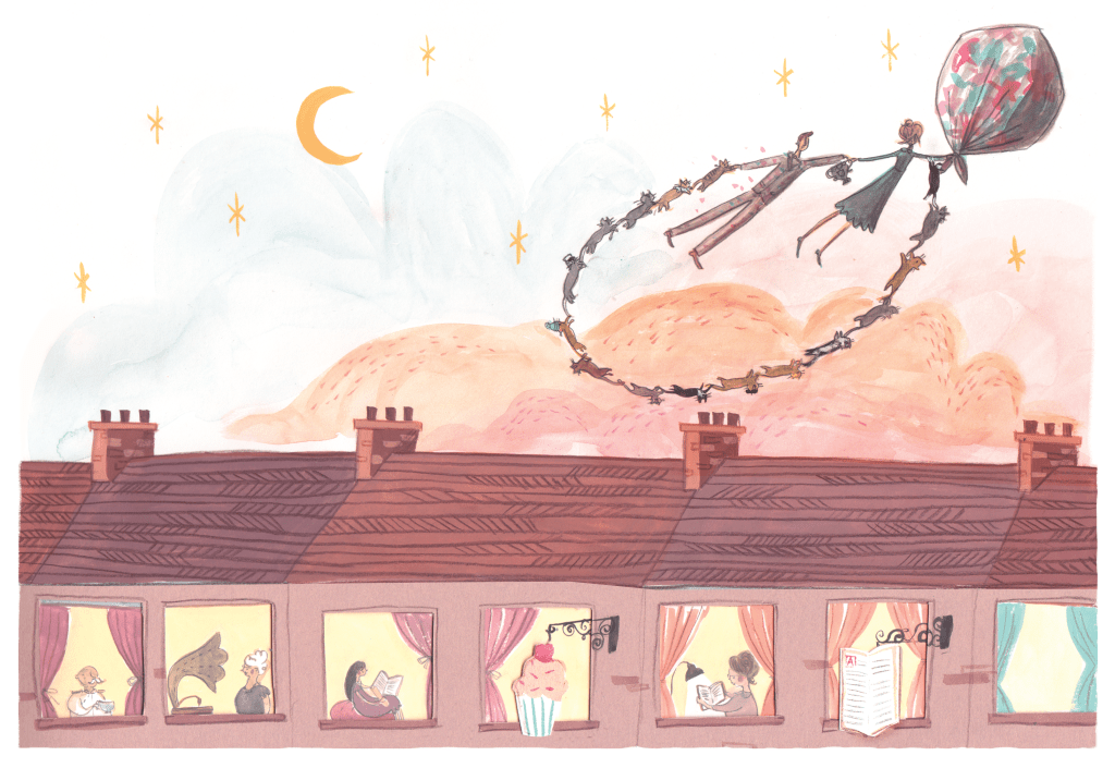 Bearnard doesn’t just passively accept his new role as literary character. He weighs the most promising possibilities: astronaut, superhero, knight. Then he decides to do a little research, and here Underwood draws in parents and caregivers as well as kids. He might emulate “a bear who floated away in an umbrella,” a bear whose favorite food is marmalade, or the three porridge-eating bears who make the mistake of leaving their home unattended. (The endings are not predetermined, with a terrifying monster taking the place of a curious little girl.) Sometimes authors take an easier route, offering in-jokes to parents that will go over children’s heads, but there is none of that patronizing tone here. Adults can explain the allusions, but even without that input, kids will relate to Bearnard’s earnest approach to his new opportunity.