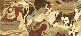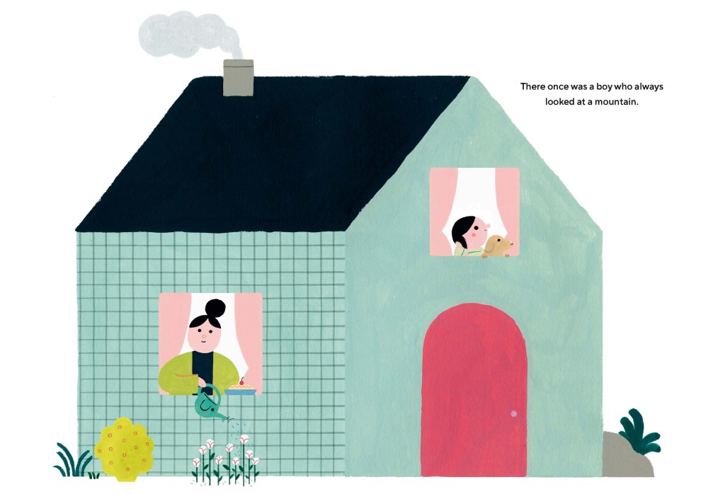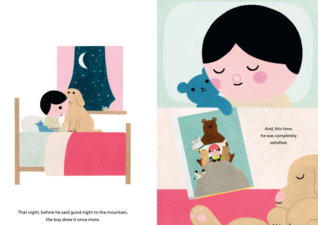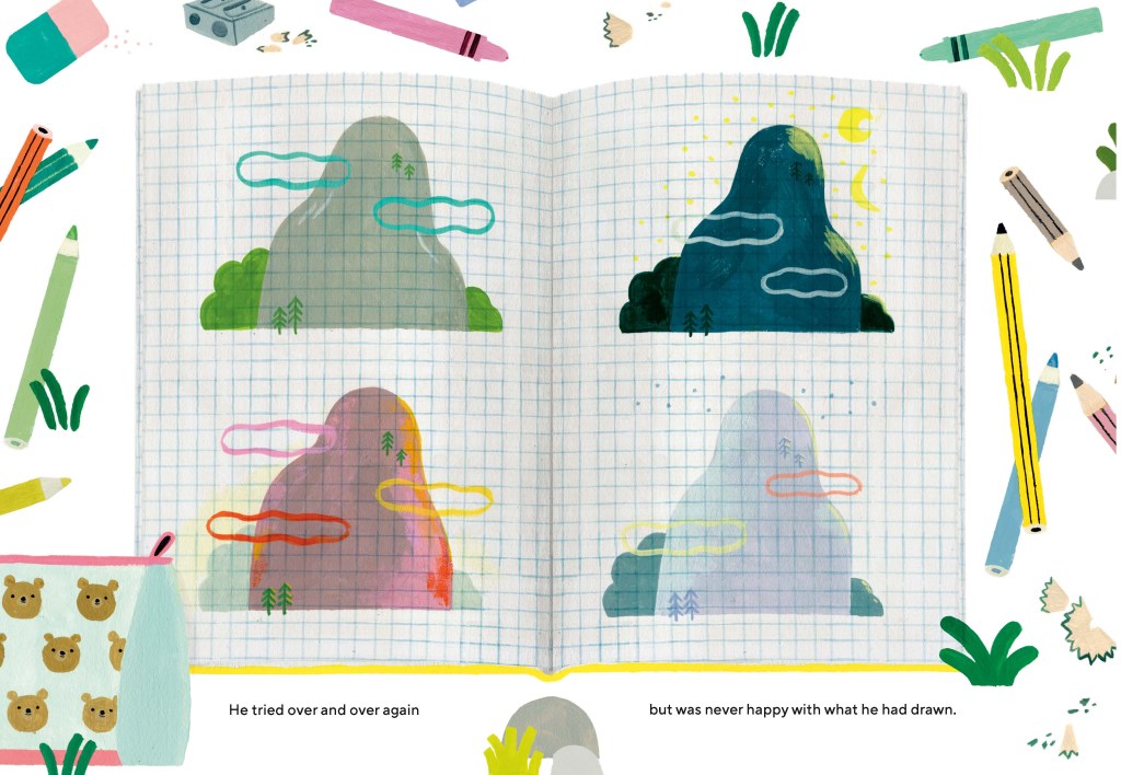 Saburi’s lovely pictures reflect her own mastery of classic children’s book illustrations, but also great use of color and composition, and sensitivity to the way that children visualize the world. In one two-page spread from Bearnard’s Writes a Book, our hero sits on a couch reading the earlier story. He is large and solid, but not out of proportion to the substantial couch, the goose friend sitting next to him, or the sagging bookshelf overlooking the scene. The facing page gives an extended view of his home, including a refrigerator also topped with books, a water cooler that dispenses honey, and a pair of sturdy boots. He’s a fully realized character. Saburi’s depiction of the writing process is also on-target, as a perfectionist challenged by writer’s block slumps at his desk and litters the floor with rejected manuscripts. The final page resolves the book’s conflicts, with Bearnard and Gertie the goose as collaborators. They look out a wide window, their backs to the reader, while absorbed in their work. Goose’s small, elevated platform to reach her desk is the kind of tool every writer needs.