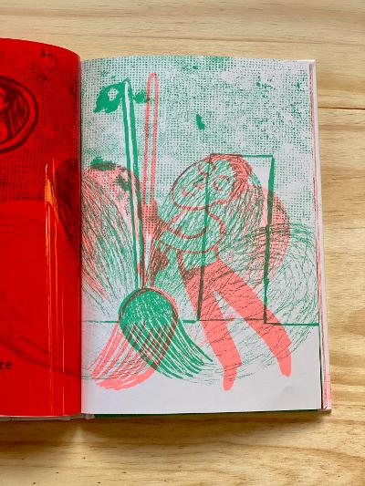 Part of the book’s brilliance lies in its composition. Oversized beets, carrots and tomatoes dominate two pages. Then, a rhapsodic, leaping man demonstrates the obligation to love borsch in his homeland as he carries the ingredients to prepare the dish. A table covered with labeled dill, sour cream, and black bread may appear inviting, but the author feels stranded, “…Robinson Crusoe, stuck on a deserted island of sour cream in a red sea of borsch.” Each image is completely original, yet also resonates with the reader’s memories. Two angels surround a golden sunflower, although it is not an approved ingredient for borsch. Ukrainian knights, as legend has it, pour borsch on their enemies. Pictures with collage elements of photos and postage stamps signify Nayberg’s voyage to the land of peanut butter and American cheese. Eventually, two black pages with one line of white text each state the truth: something was missing from Nayberg’s life. Something which she had once hated, but now longed to prepare becomes the book’s focus.