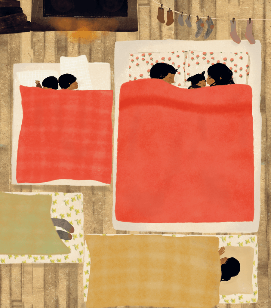 Life is not easy for Ernestine and her mother. Ernestine’s father is “off in the war,” and she and her mom are responsible for keeping the farm running. (The “Author’s Note” explains that the story takes place in 1942.) Ernestine’s lovely, strong mother assures her that they are a team: “I’m the Big Dipper and you’re the Little Dipper, and way over in Germany, Daddy sees the same stars we do up there in the Milky Way.” This. matter-of-fact poetry characterizes their closeness and warmth, as do the pictures of mother and daughter under a quilt with star motifs, and the two embracing after Ernestine has completed her special mission. A neighboring family with many children needs milk as much as they do, and Ernestine is given the challenging task of delivering two mason jars full of the liquid to their friends.