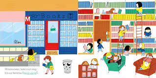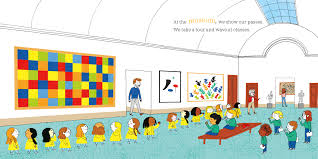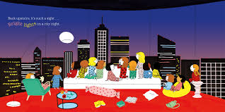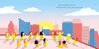 Father and son take the same walk throughout the four seasons, changing their clothing to suit the weather. Neighbors emerge from buildings resembling brightly colored blocks. Some are fully depicted figures, while others are silhouettes behind doors or viewed through windows. We are in the city, but also in a world where children easily identify who and what is important to them. “Everyone is rushing, but we’re taking our time,” the author states, as father and son watch busy people heading to work. They reciprocate waves from everyone: a newsstand owner, and a woman on a park bench feeding birds, workers unloading a truck. There is no social hierarchy; even dogs merit attention, whether they are being walked on leashes or sitting like humans in a car. There is a beatnik in sandals.