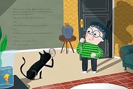 The opening end papers introduce Tucker in some typically frenetic canine activity. Then it escalates, as every home the shelter finds for him is subjected to chaos. Tucker manages to overturn an aquarium and books in one place. He grabs a girl’s sweater and won’t let go. A man attempting to read his newspaper looks enraged as Tucker grabs it and leaves a litter of overturned items in his wake. When we next see him, Tucker is a lonely prisoner in a cage, “watching everyone pass him by.”