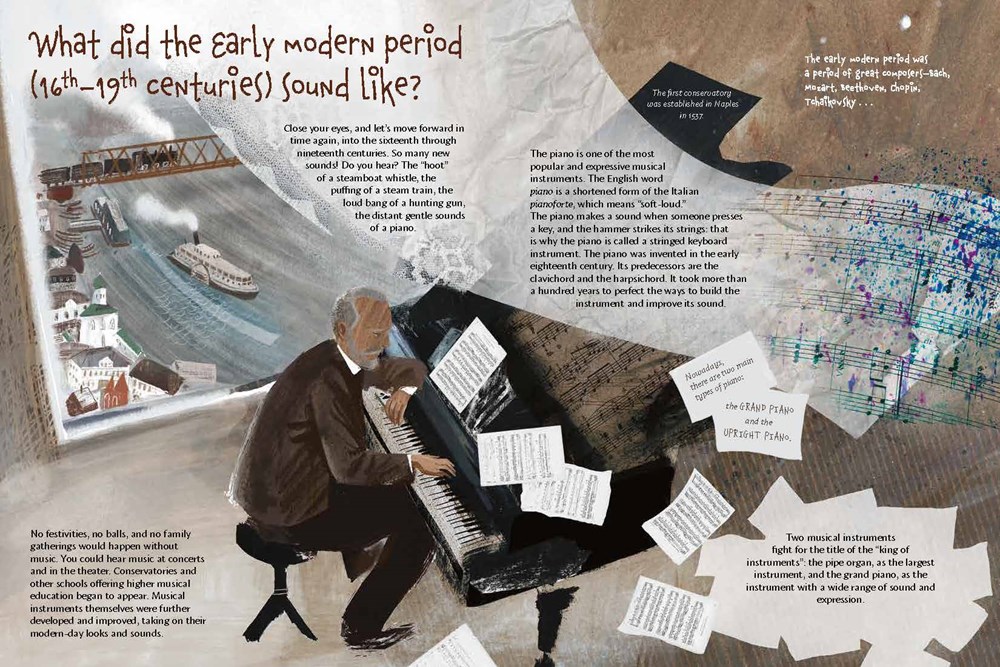 These penguins do not even all dress alike. They are mechanics, explorers, athletes, musicians, and artists. Aboard their adventurous cruise, they have as many different professions as the residents of Celesteville in Babar the King. When the book begins, Chibi the Penguin and his family are about to board ship for a cruise. The magnificent vessel, which opens from the center as a four-page spread, contains every activity possible enroute to a mysterious location. Cutaway images of the ship invite readers inside, as in Richard Scarry’s works or the European wimmelbooks that inspired him and continue to be fascinating to children (see more here).